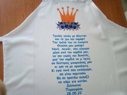 Εκτύπωση σε προσωποποιημένες ποδιές βάπτισης για τη νονά και το νονά σε σχέδια της επιλογής σας. Εκτύπωση σε ποδιά νονάς με θέμα κορώνα
