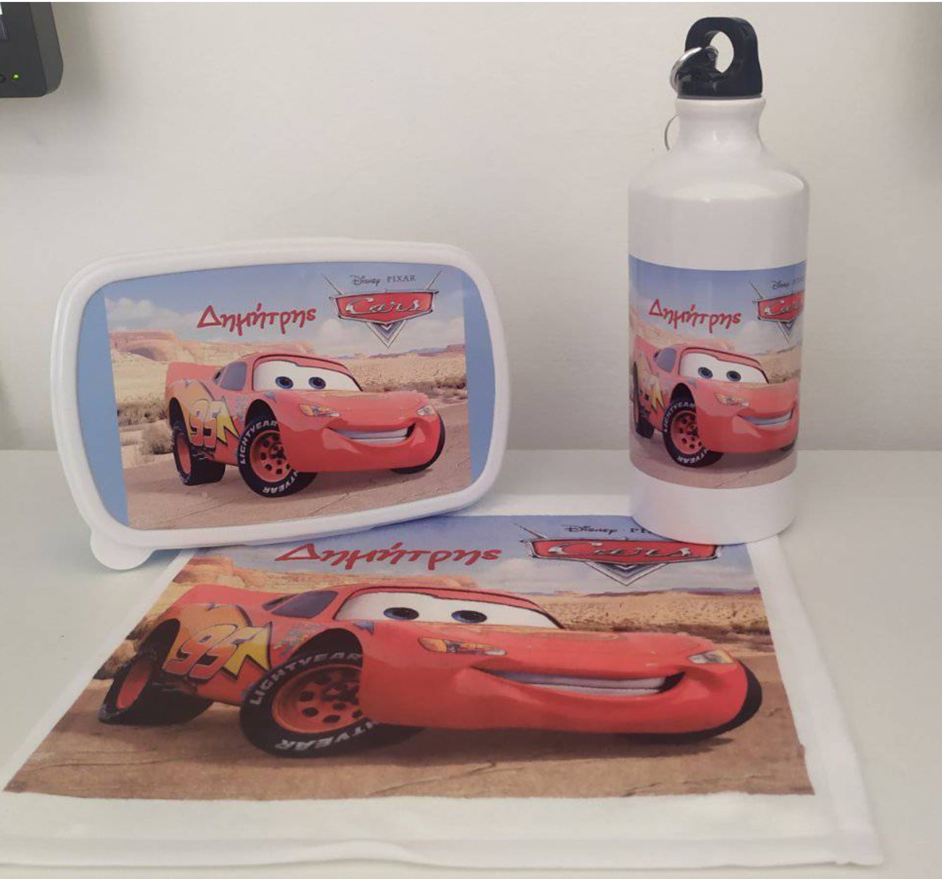 Παγουρίνο-ταπεράκι-πετσετούλα με όνομα και σχέδιο αμαξάκι.