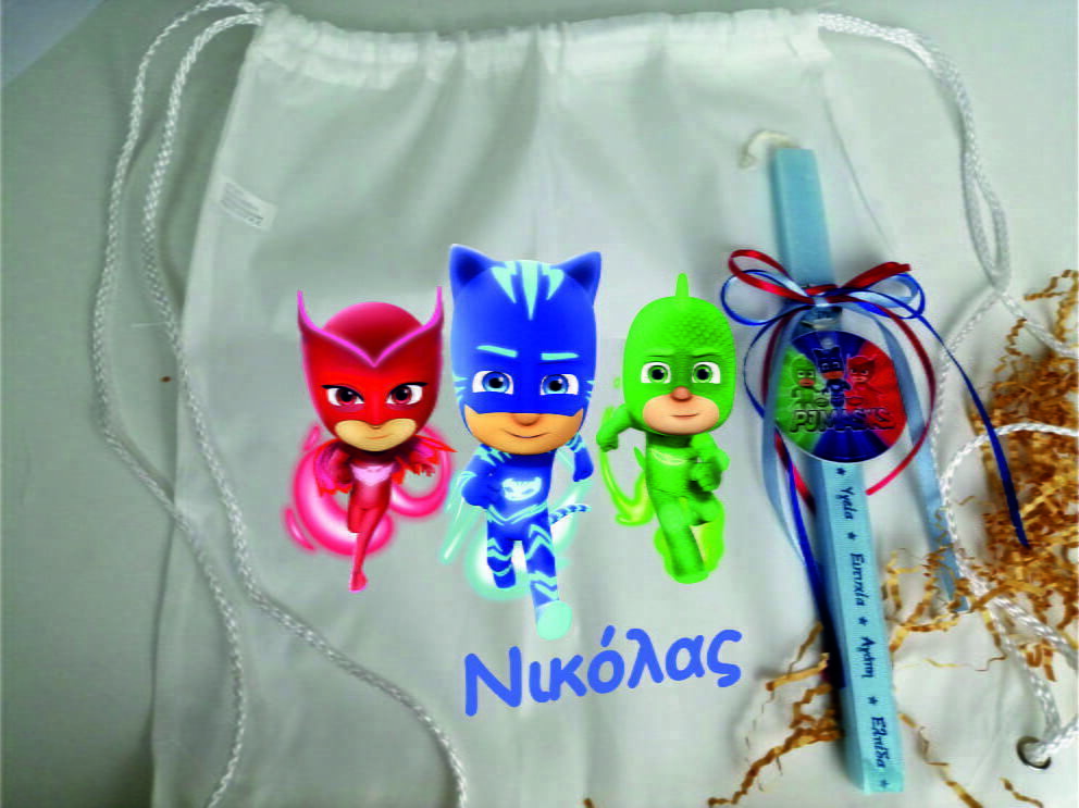 Μοναδική χειροποίητη αρωματική λαμπάδα μπιτζαμοήρωες σετ με σακίδιο πλάτης.Πασχαλινή αρωματική λαμπάδα για αγόρια.